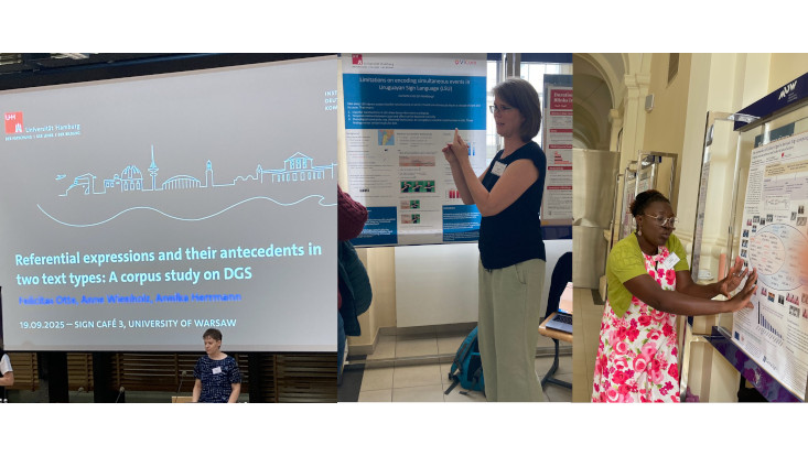 On September 18 and 19, 2025, the third Sign Café Conference took place in Warsaw, Poland. The IDGS was represented with contributions on various sign languages – from DGS to Kenyan Sign Language to Uruguayan Sign Language. Felicitas Otte gave a presentation on referential expressions in the DGS corpus. Hope Morgan and Margaret Odhiambo reported on color signs in Kenyan Sign Language in a poster presentation, and Cornelia Loos' poster looked at with phonological restrictions of two-handed signs. Pierogi and borscht provided the backdrop for exciting discussions with researchers from all over the world.