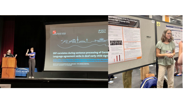 In a bimodal bilingual presentation (International Sign and English) entitled “ERP correlates during sentence processing Germ Sign Language agreement verbs in deaf early child signers,” Janika Stille and Anne Wienholz presented initial findings from a joint research project between IDGS and D2L. Annika Herrmann and Agnes Villwock (Rochester Institute of Technology) presented their research on “When signs slip the mind: A corpus-based study of the tip-of-the-fingers phenomenon in German Sign Language (DGS)” on a poster. All contributions met with lively interest and received supportive feedback from the international research community. We enjoyed the time and were very happy to meet many colleagues and friends from other countries and research institutions.